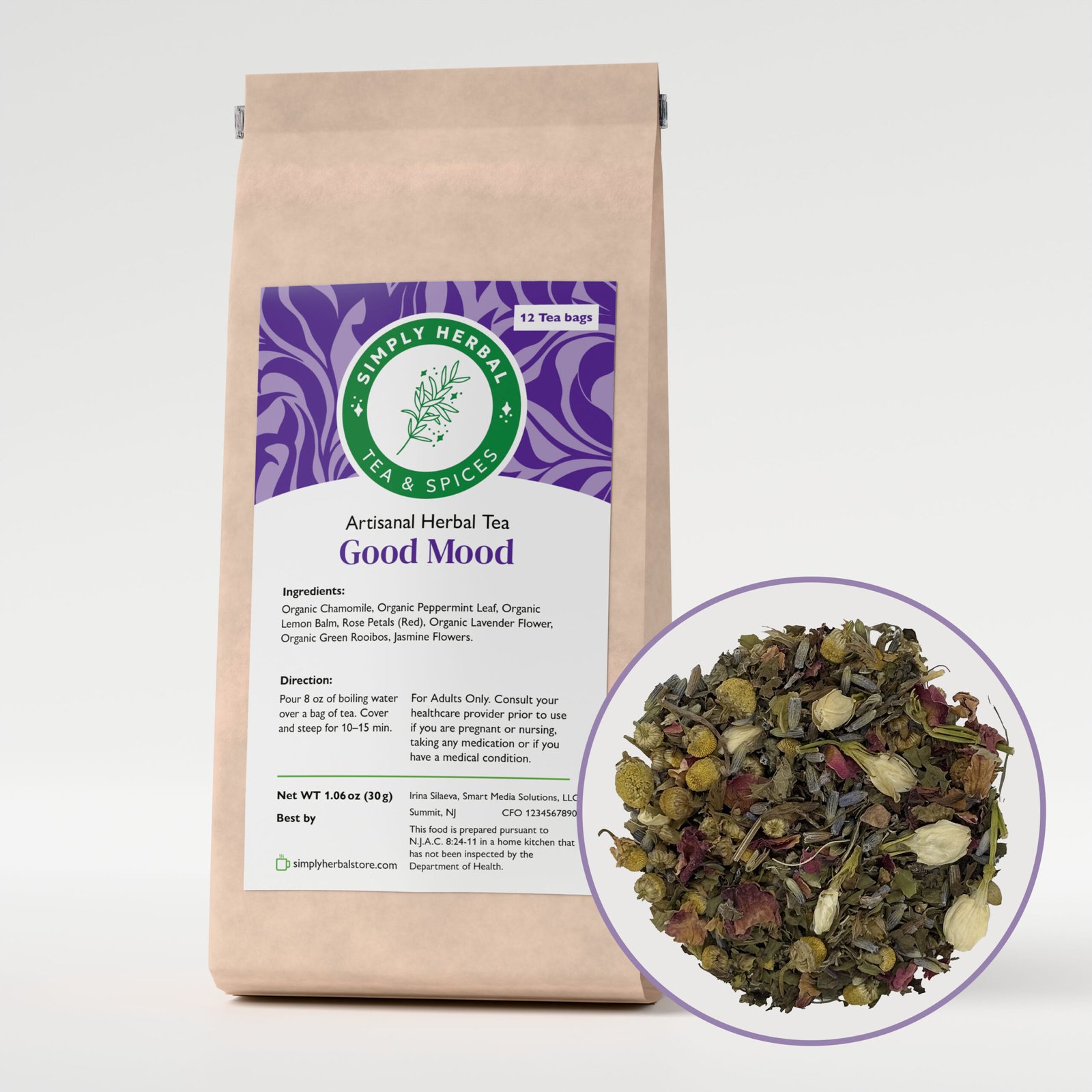 Organic Chamomile, Organic Peppermint Leaf, Organic Lemon Balm, Rose Petals (Red), Organic Lavender Flower, Organic Green Rooibos, Jasmine Flowers.